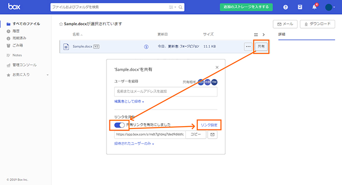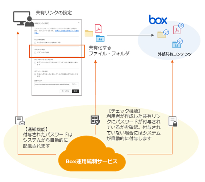 社外の方とBoxでファイルを共有する場合、共有リンクを作成してメールの本文に記載したり、コラボレーションという機能を使って社外アカウントと共有する方法があります。共有ファイルにパスワードを設定することもできますが、強制する機能はありません。